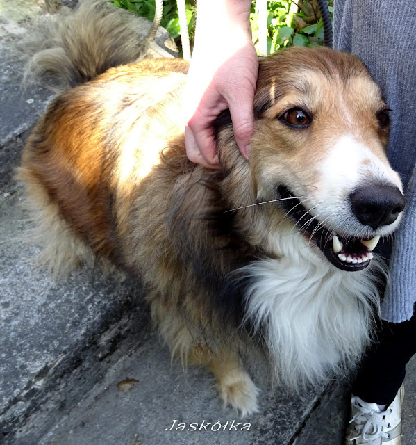 Uczymy się chodzić na smyczy. Pamiętam, że pierwszy raz na smyczy zaliczyła dłuższy spacer na przełęcz Karkoszczonkę w Brennej. Idziemy sobie spokojnie, Beza chodzi z jednej strony traktu na drugą, wącha, przystaje. Nagle pojawia się przed nami, schodząca para z psem- większym od Bezy psem. Beza zjeża futro na karku, ale stoi posłusznie obok nogi Jaskóła. Uspokajamy turystów, których pies trochę powarkuje, ale idzie karnie przy nodze pana, że Beza jeszcze mała i nic nie zrobi. W tym momencie Beza "wychodzi" z kubraczka i podbiega do psa. W ostatniej chwili złapałam ją za ogon. Niechybnie wielki pies pożarłby małą głupolkę. No jasne, nic innego tylko luźnawy kubraczek był winny, a nie śliczna piesiunia.