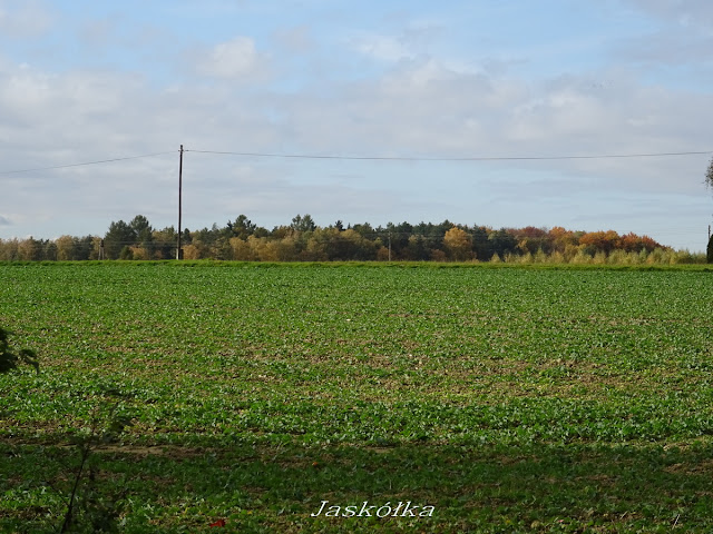 Po prawej stronie kończy się płot, a miedzy został już tylko kawałek, potem zaczyna się droga dojazdowa do jednej z posesji. Ja jednak patrzę wyżej i zachwycam się kolorami, jakie mam przed sobą.Widać część zagajnika ( znów w przybliżeniu) w którym jesienią nawołują się puszczyki. Przypuszczam też, że mają tam gniazda myszołowy.